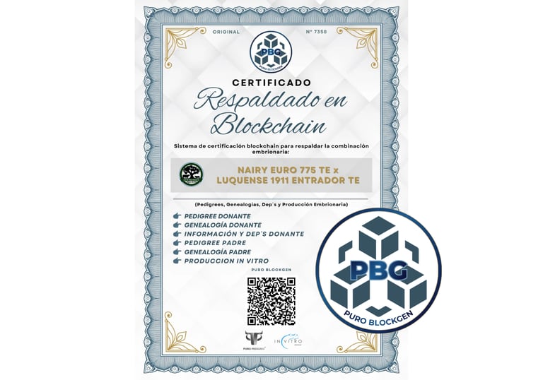 Puro BlockGen es la Tecnología de Certificación Blockchain desarrollada por Puro Pedigree® para certificar embriones bovinos y lotes de embriones, registrando su información genética y producción mediante Blockchain, garantizando que los datos sean auténticos, inalterables, trazables y verificables.