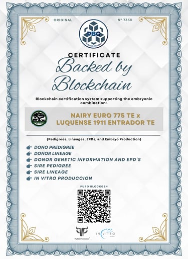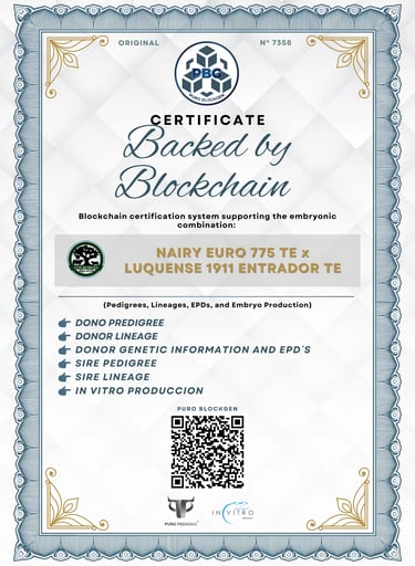 Puro BlockGen is the proprietary Blockchain certification technology developed by Puro Pedigree® to certify bovine embryos and embryo lots. It records genetic information and production data on the blockchain, ensuring authenticity, immutability, traceability, and verifiability of all information.